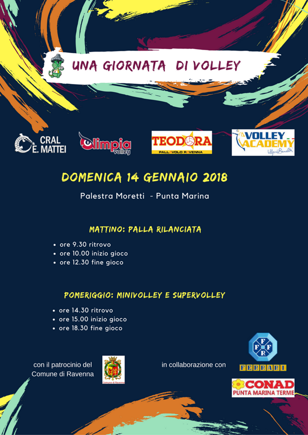 Domenica 14 Gennaio, presso la palestra di Punta Marina, si è svolto il primo Giocaland organizzato da quattro società di pallavolo ravennati: TEODORA PALLAVOLO, VOLLEY ACADEMY, OLIMPIA VOLLEY e CRAL E. MATTEI.